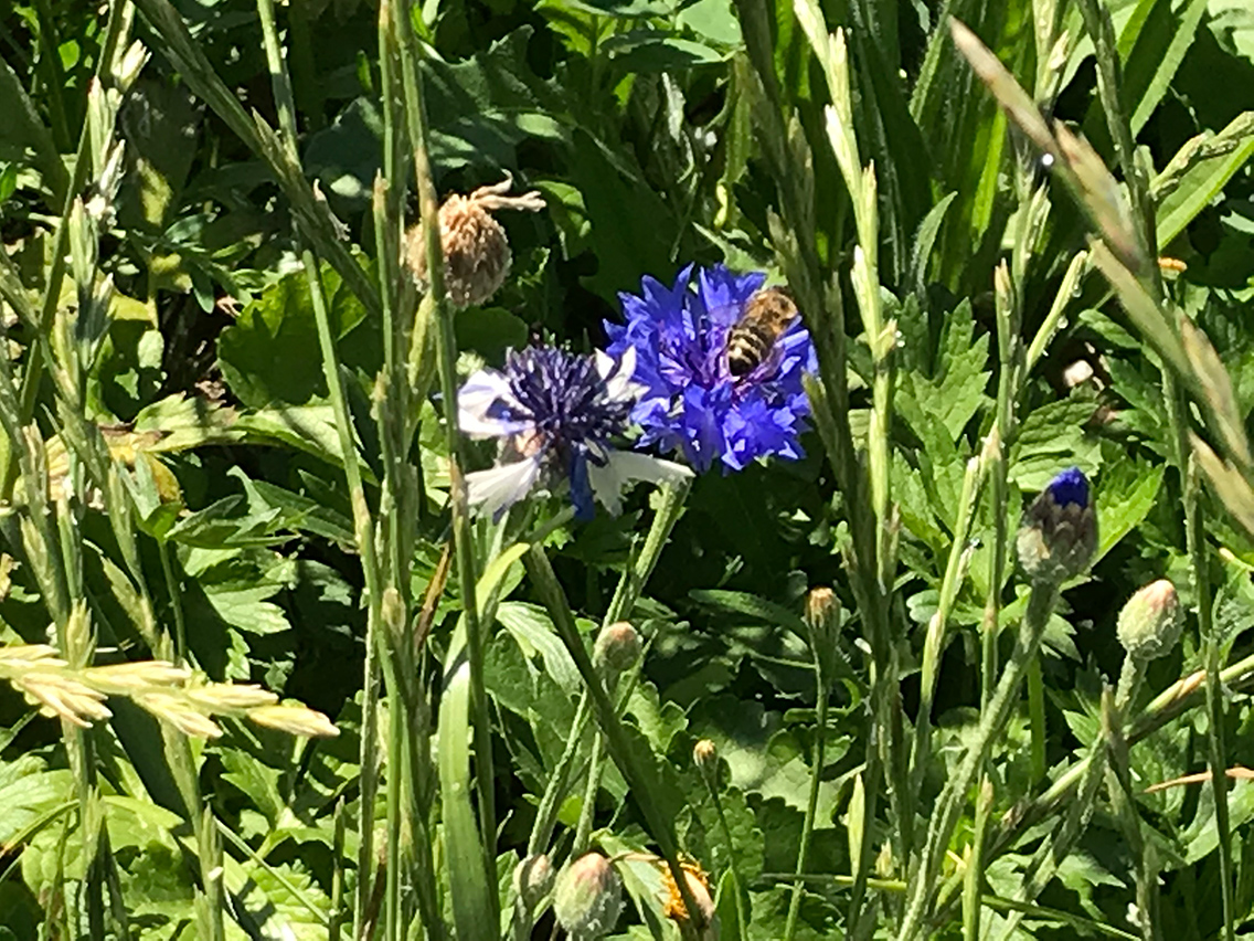 Bleibt ein Teil des Gartens unbearbeitet, haben wir die Chance auf natürlichem Wege Wildblumen wachsen zu lassen. Wir können aber auch Wildblumen als Blühstreifen (z.B. eine Bienenweide) ansähen. Die Kunst ist hier Geduld zu haben, abzuwarten und zu beobachten – und nichts zu tun. Vielleicht kommt plötzlich ein Stieglitz angeflogen und nascht versteckte Sämereien aus stehengebliebenen, verdorrten Blütenständen. Jede Pflanze hat Lebewesen, die von ihr als Wirt abhängig sind. Fehlen diese Pflanzen, reduzieren sich die Tierarten. Stichwort Biodiversitätsverlust.