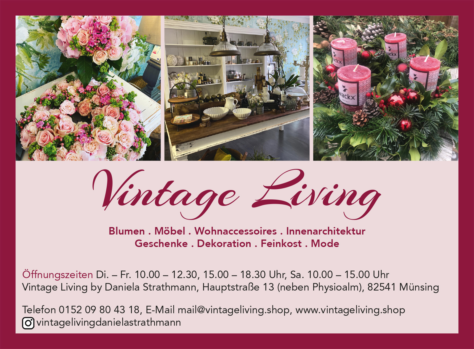 Unter diesem Namen hat Daniela Strathmann ihren neuen Laden Anfang Oktober diesen Jahres in Münsing eröffnet. Als Vintage Living betreibt sie in Hohenschäftlarn seit 2015 ebenfalls einen kleinen Laden und hat mit ihrem liebevoll ausgesuchten Sortiment aus Möbeln, Wohnaccessoires, Blumen & Pflanzen, Feinkost und einer kleinen Auswahl an Mode eine treue Stammkundschaft gewonnen. Die gelernte Schauwerbegestalterin, studierte Innenarchitektin und ausgebildete Feng-Shui Beraterin hilft auch bei der richtigen Zusammenstellung von Möbeln, Wohnaccessoires sowie der richtigen Farbauswahl um das Zuhause ihrer Kunden in eine Wohlfühloase zu verwandeln.
